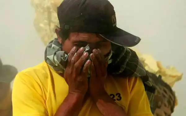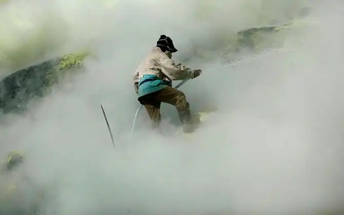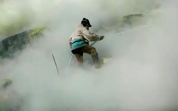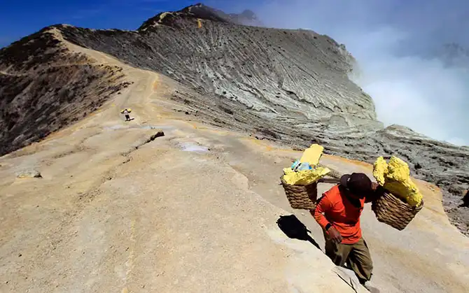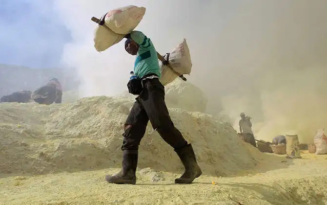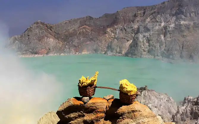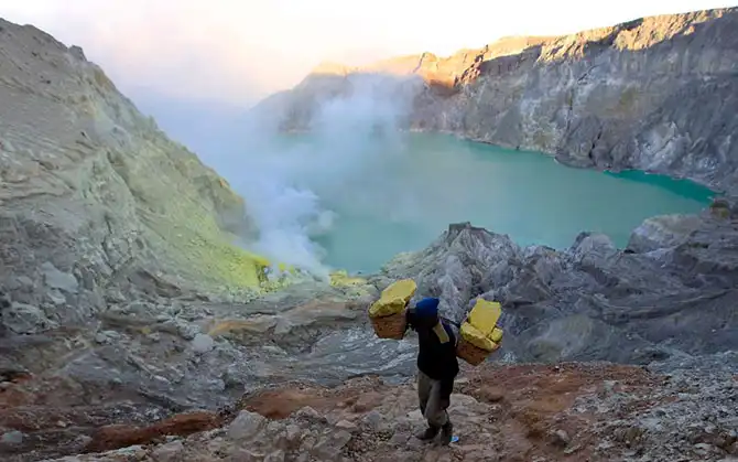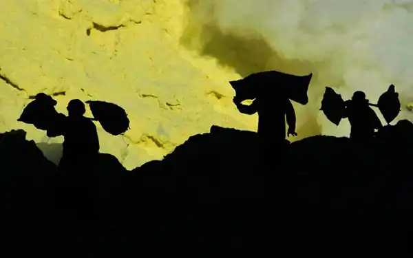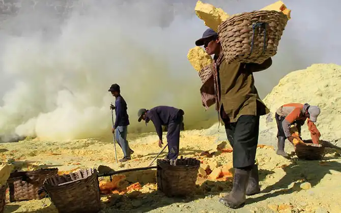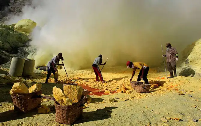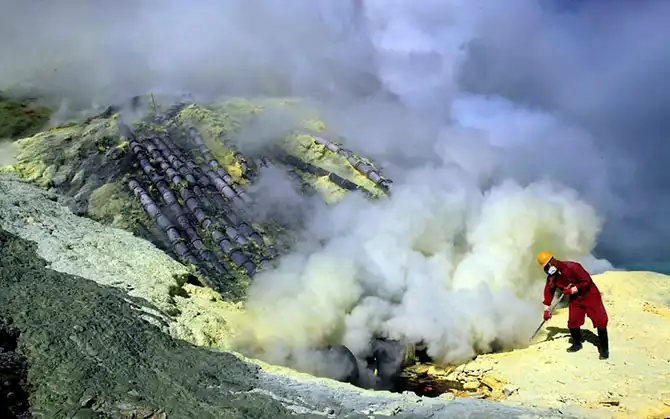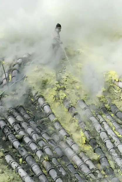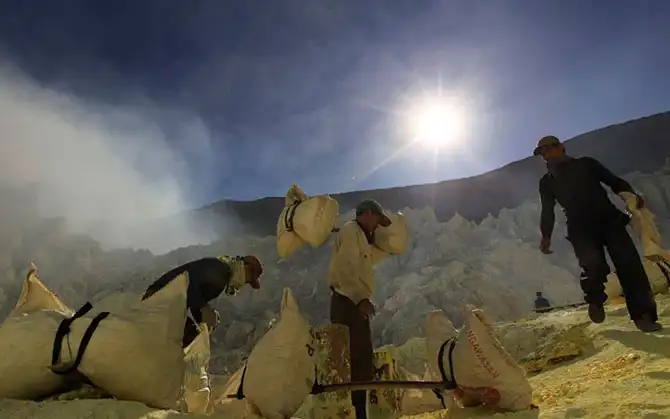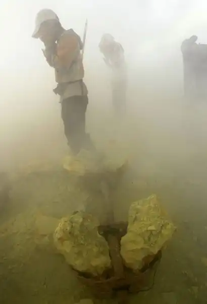 Внутри кратера вулкана Иджен на Восточной Яве, Индонезия, шахтеры работают в ядовитых парах серы, которая подвергает их высокому риску респираторных заболеваний. Вулкан Иджен возвышается на 2800 м с кратером глубиной более 200м и шириной почти километр, наполненным серной кислотой.