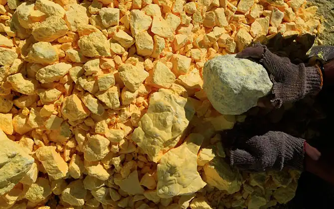 Около 200 шахтеров ежедневно зарабатывают на жизнь, используя металлические пруты, чтобы разбить плотные куски желтой серы, вылившейся из труб, закрепленных в трещинах.
