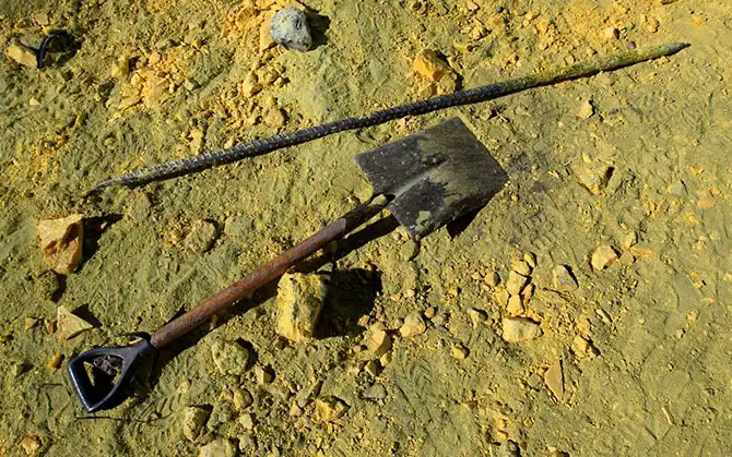 Лопата и лом лежат на земле в месте, где идет добыча серы на вулкане Иджен Кавах.