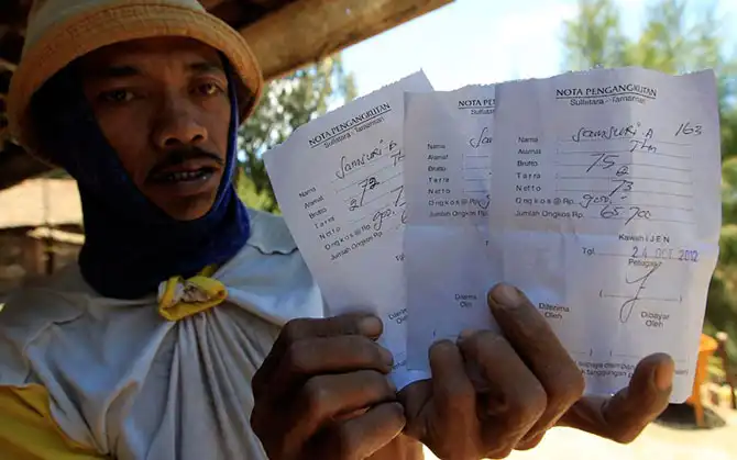 Шахтеры получают заработную плату в зависимости от того, сколько серы они доставили. Большинство шахтеров осуществляют доставку два раза в день, зарабатывая от 70.000 до 80.000 (около £4,50-£5,20).