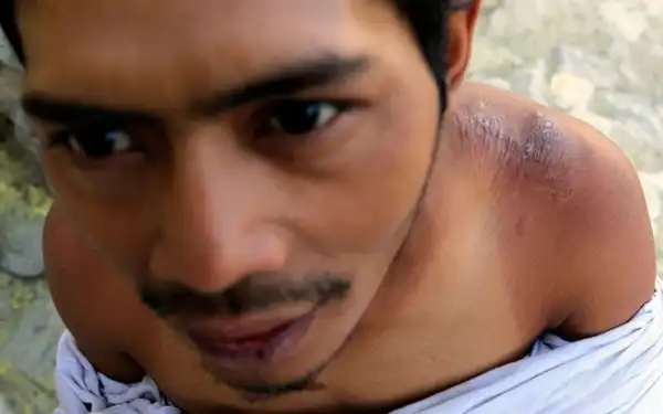 Индонезийский шахтер показывает шрамы на плечах от переноски тяжелых корзин серы.