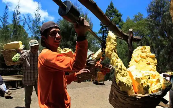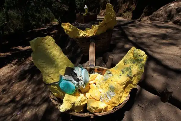 Они загружают тяжелые куски серы в корзины и несут их к краю кратера. Затем шахтеры несут корзины весом до 90 кг на расстояние трех километров в пункт сбора.