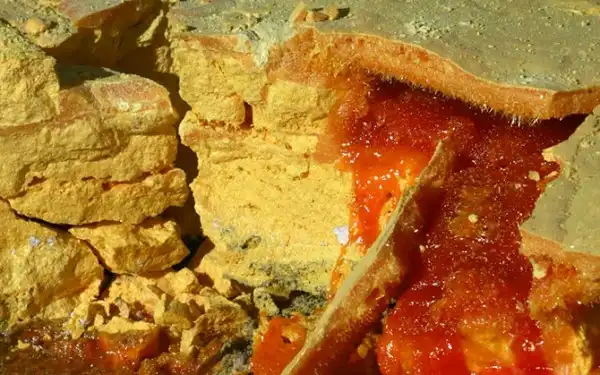Сера, которая в расплавленном состоянии имеет темно-красный цвет, медленно выливается с концов этих труб и бассейнов на землю, приобретая по мере охлаждения ярко-желтый цвет.