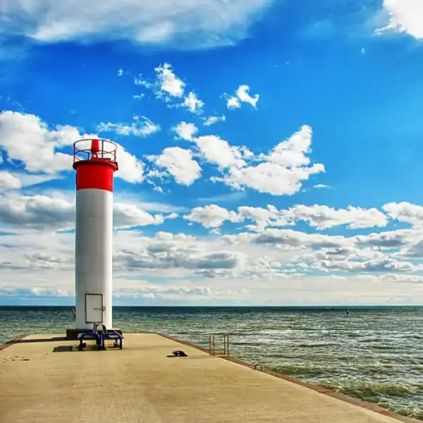 Сияющий в порту Расин, штат Висконсин, этот маяк является домом для конференц-центра, конференц-зала, а часть времени служит для деревенского отделения милиции.