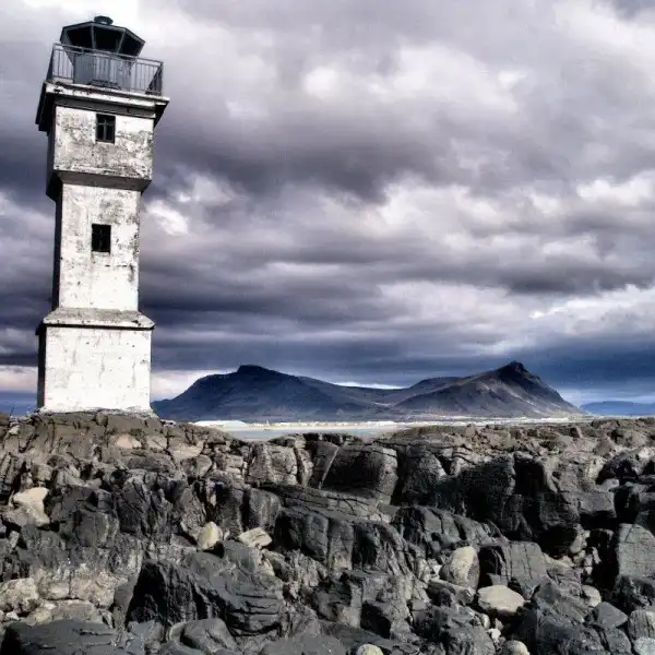 Этот старый маяк установлен на вулканических ландшафтах Исландии около Акранеса, 9-го самого густонаселенного города страны. Почти все жители Исландии живут на побережье из-за гористой лавовой пустыни и ледникового рельефа внутренней части территории.
