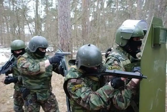 с 50-килограммовым щитом, бронежилетом, табельным оружием, патронажем