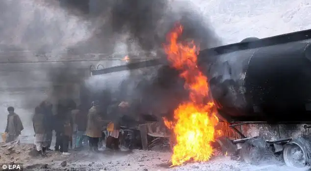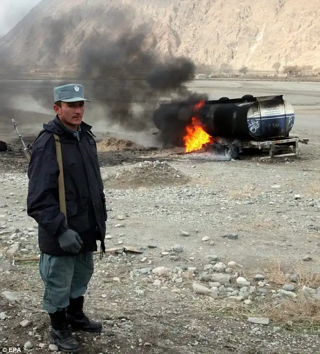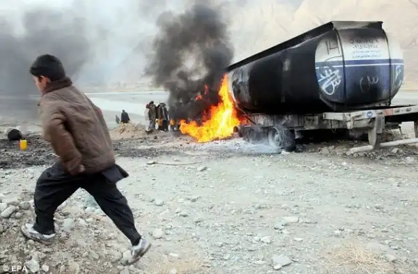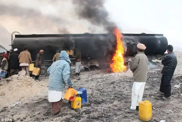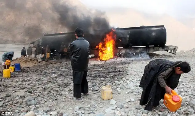 Местные аборигены взорвали бензовоз НАТО в Афганистане и пока горючка сильно не разгорелась, они начали заполнять емкости горючей смесью. :crazy: