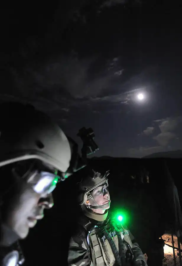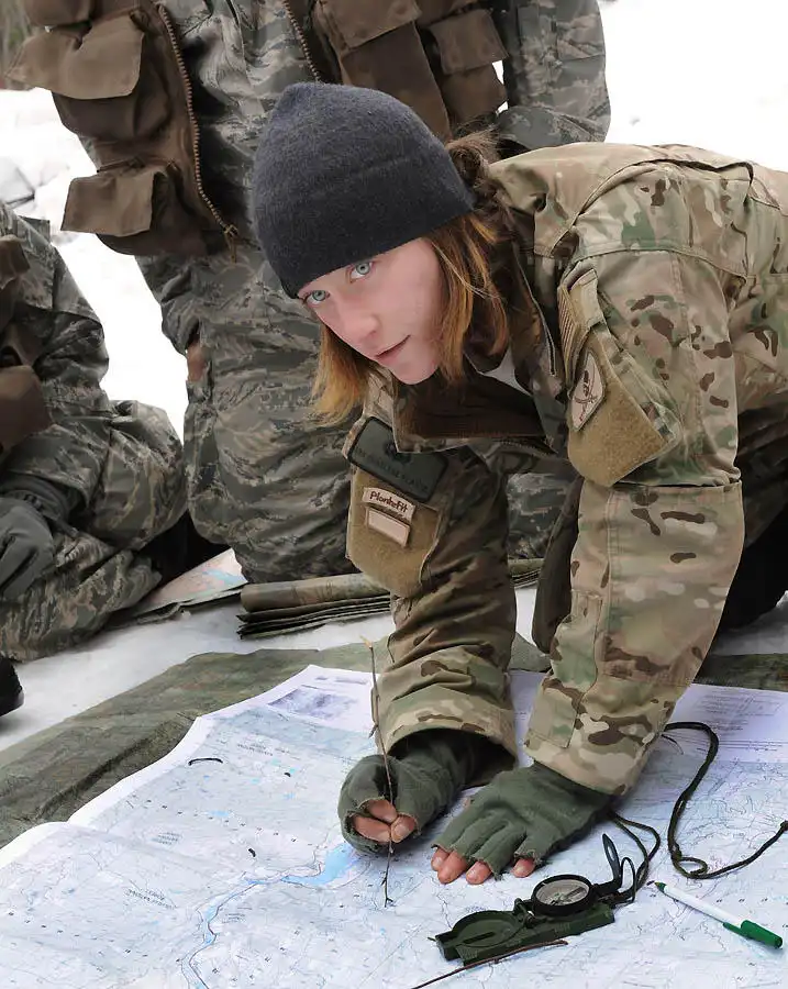 19. Старший рядовой военно-воздушных сил США Шарлин Плант проводит вычисления для определения места нахождения противника на тренировочном занятии. 13 марта 2011.