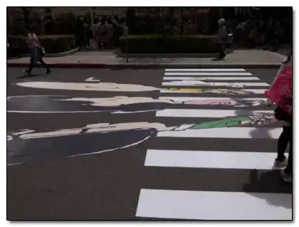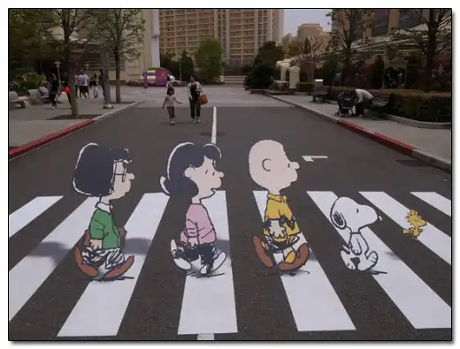 Здесь изображены герои популярного комикса и мультфильма «Peanuts», воссоздающие известную обложку альбома Битлз «Abbey Road». Этот коллаж расположен на дороге, ведущей в парк развлечений Universal Studios в Японии. Отвлекать водителей на дороге в детский парк это, наверное, не самая лучшая идея, но японцы, скорее всего, уже привыкли к разгуливающим по улицам персонажам из мультфильмов (и куче других странностей). Кроме того, вид как на фото открывается только строго под определенным углом. Любой, кто будет смотреть на это сверху, удивится «почему этих милых детишек засасывает аппарат из Охотников за привидениями».