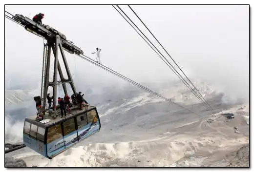 Ни вид, ни чувак на канате не выглядят реальными на этом фото, но это реальный каскадер, идущий по канатной дороге, которая ведет от основания до вершины горы Цугшпитце в южной Баварии. Он выполнил 3-километровое восхождение для Книги рекордов Гиннеса в категории “самый длинный и высокий проход по канату над уровнем моря без балансира”. И, для ровного счета, он сделал это без чертовой страховки.