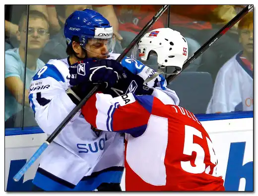 К сожалению для хоккейной команды Норвегии, игрок номер 55 Оле-Кристиан Толлефсен не обладает способностью к телепортации из щекотливых ситуаций. Если вы посмотрите на левую подмышку, то сможете увидеть волосы и определить позицию его зажатой головы. Хотелось бы думать что рыжий малец был фанатом X-Men, и вышел с игры, говоря отцу: “Я это видел, они существуют!”