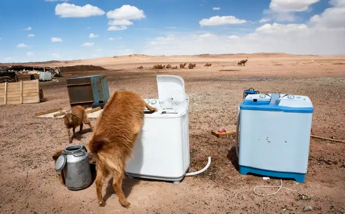 Изнемогающая от жажды коза в пустыне Гоби пьет воду из стиральной машины. Наряду с выпасом, местные семьи работают в шахтах, чтобы обеспечить дополнительный доход на солнечные панели, стиральные машины и т.д.