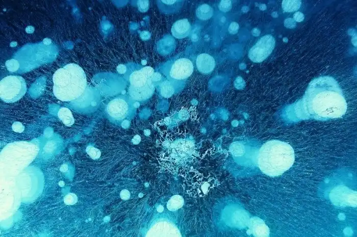 А зимой, когда погода становится все более холодной, эти пузырьки воздуха начинают накапливаться под поверхностью озера.