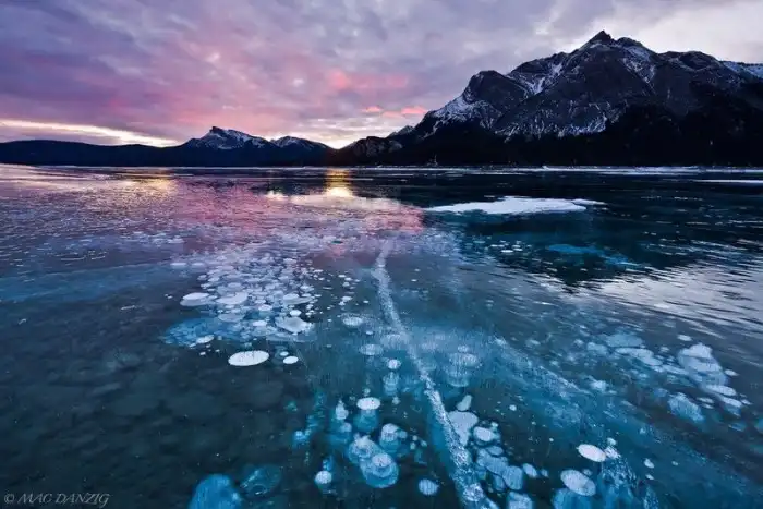 Озеро Абрахам – это искусственный водоем на реке Северный Саскачеван в западной части Альберты, Канада. Озеро было создано в 1972 году после строительства плотины Бигхорн и названо в честь Силаса Абрахама – жителя долины реки Саскачеван 19-го века. В этом озере можно наблюдать редкое явление – пузырьки воздуха, которые замерзают прямо под поверхностью воды. Их часто называют ледяными пузырями или замерзшими пузырьками.
