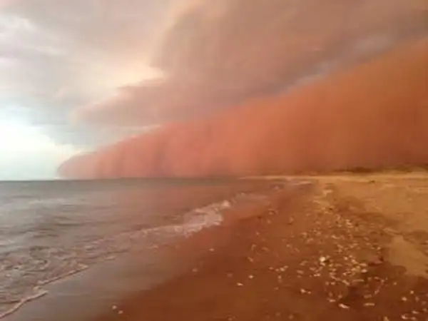 на побережье удивительной "волной" из песка и пыли красного цвета.