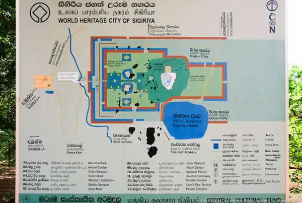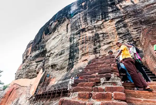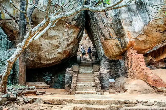 Взобраться на скалу можно было по лестнице, берущей начало у подножия скалы между лап гигантского льва, высеченного в камне (лев — символ сингальского народа, он также изображен на государственном флаге Шри-Ланки). К сожалению, до наших дней сохранились только его мощные лапы: