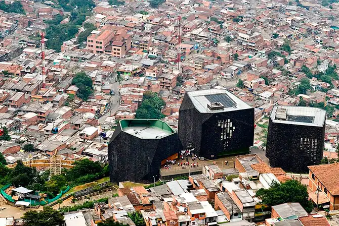 Правительство Колумбии решило бороться с преступностью в трущобах. В самых бедных кварталах начали строить спортивные комплексы, пешеходные зоны, театры и библиотеки. Результаты отличные – теперь подростки, вместо того, чтобы продавать наркотики и заниматься грабежами, сидят в интернете, читают книжки и занимаются другими благовидными вещами. Конечно, преступность совсем не исчезла, но впервые за многие десятилетия в трущобы стало можно заходить без взвода спецназа. Сегодня я покажу вам несколько проектов библиотек, которые здесь строят.