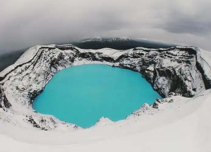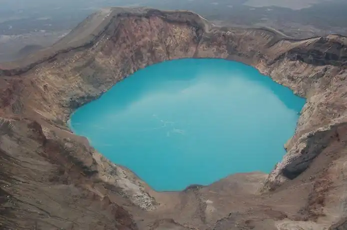 наличием интересного озера ядовито-бирюзового цвета в кратере.