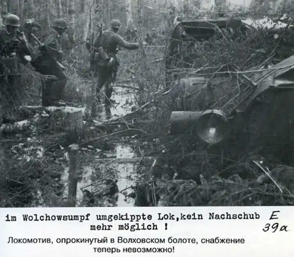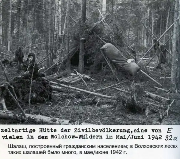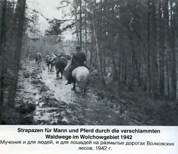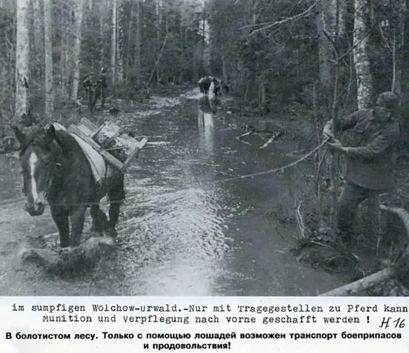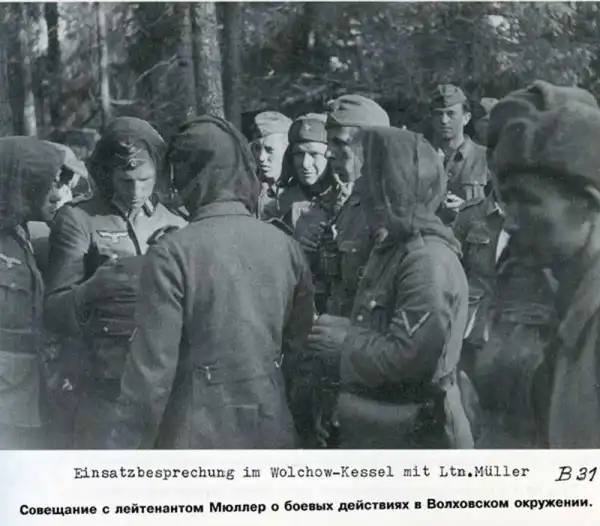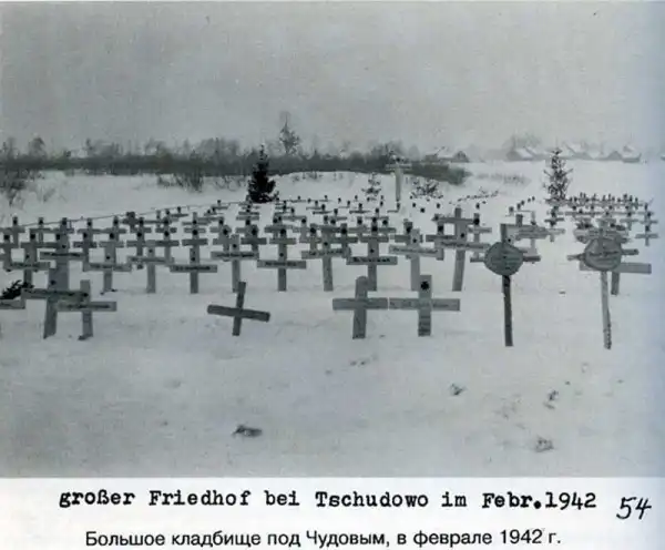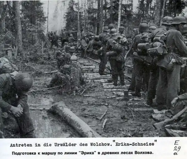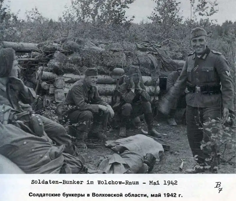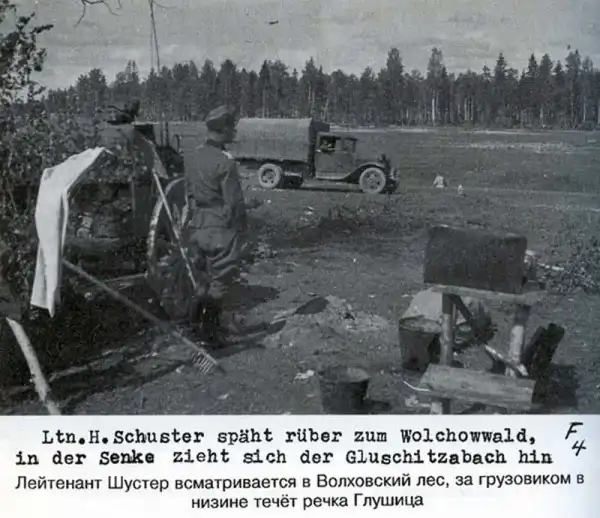 оврага и цепью побежали в Теремец. Руки у бойцов были сомкнуты впереди и спрятаны в рукава, а винтовки висели у них на ремнях. Мы тоже все по команде комбата «Вперед!» бросились на лед Волхова и побежали к Теремцу. На Волхове весь снег был исчерчен полосами от пуль перекрестного огня пулеметов, образуя квадраты по 40—50 см. Такой плотный огонь не оставлял никакой надежды на выживание».