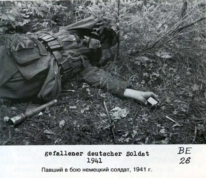 Еще один момент - павший в бою немецкий солдат. Рядом папироса, в руке спички. Колотушка прямо под боком - как-то все неестественно выглядит, будто постановка. Цель неясна, правда, такой постановки. Но одно точно - нифига не в бою...