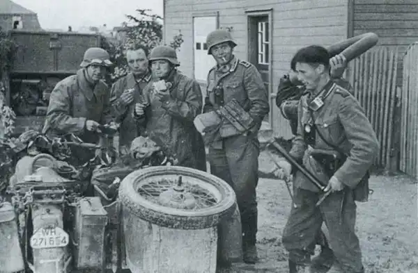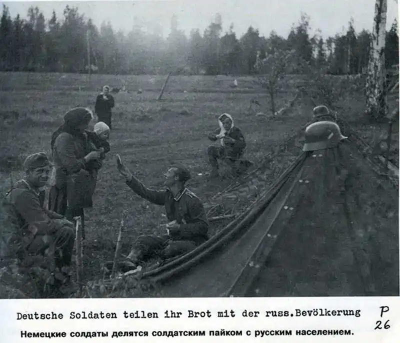 "Немецкие солдаты делятся солдатским пайком с русским населением" - тоже мне добрячки. Это как сжечь хату соседа, а потом пожертвовать ему свои тапочки. Сидели б лучше в своей ублюдошной Германии эти выродки. Какое счастье, что мы им жопы порвали!