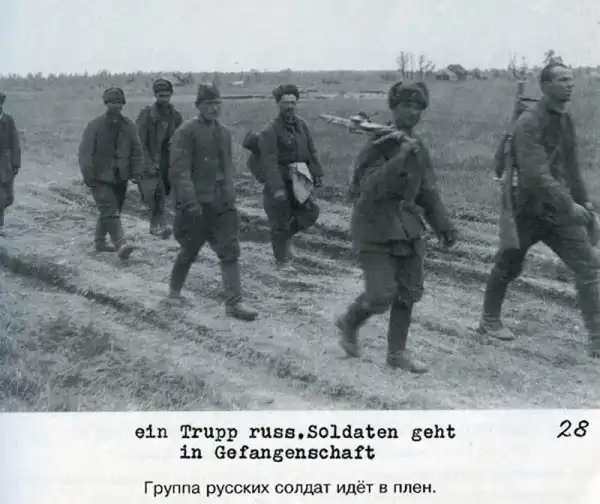 Как фото - очень интересный материал, много новых увидел, а вот подписать их можно как угодно: "идут в плен", а может "передислоцируются на новые позиции". Обычная пропаганда того времени, совсем не уместная сейчас. Только из-за перевода подписей не плюсую!