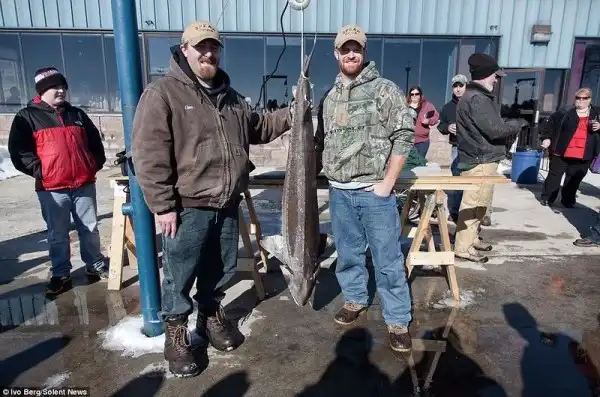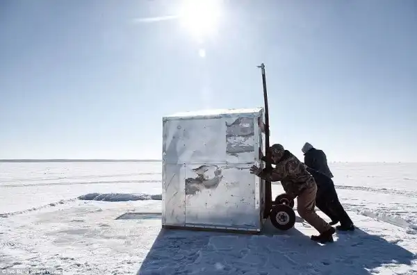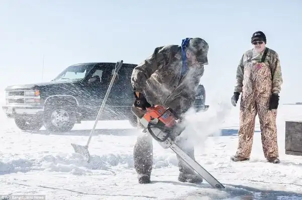 Рыбаки, в попытке поймать осетра, рискуют жизнями двигаясь по замершему озеру Виннебаго (Winnebago).Озеро находится в штате Висконсин США, на котором каждую зиму открывается сезон отлова этой ценной рыбы.