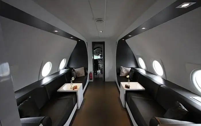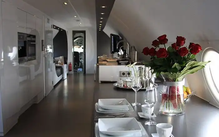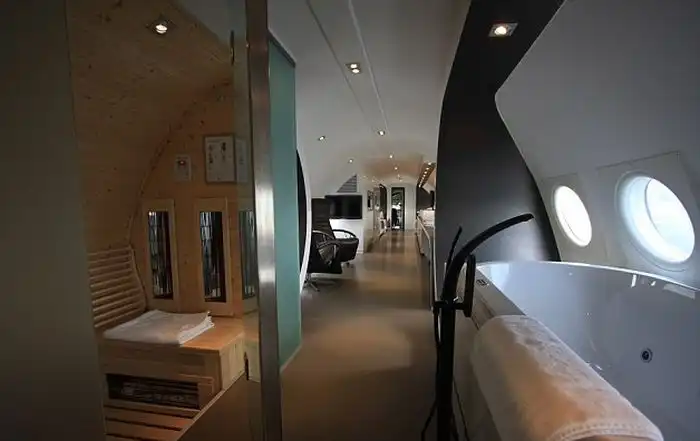 Самолет оснащен джакузи, душем, сауной, тремя телевизорами,