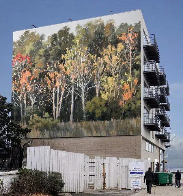 Стена дома выкрашена в серый цвет, и в пасмурную погоду она сливается с небом.