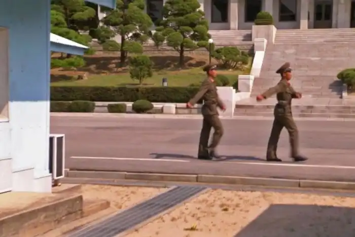 3 северокорейских солдата напротив. Ходят слухи, что если один попытается убежать к южанам