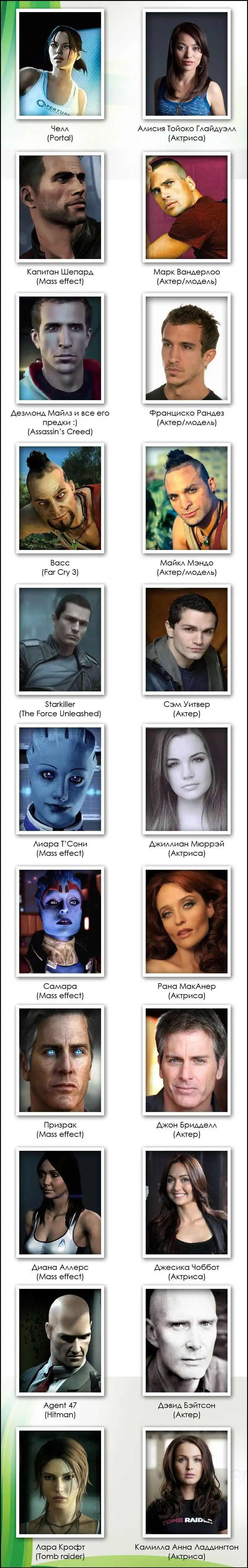 Увы, но большинство персонажей для меня ассоциируются с актёрами озвучки. Нежели моделями. Из этого списка и лицо и голос принадлежит только Миранде/Strahovski. Шепарда озвучил Марк Мир , Лиару Элли Хилис. Призрака сам Мартин Шин.