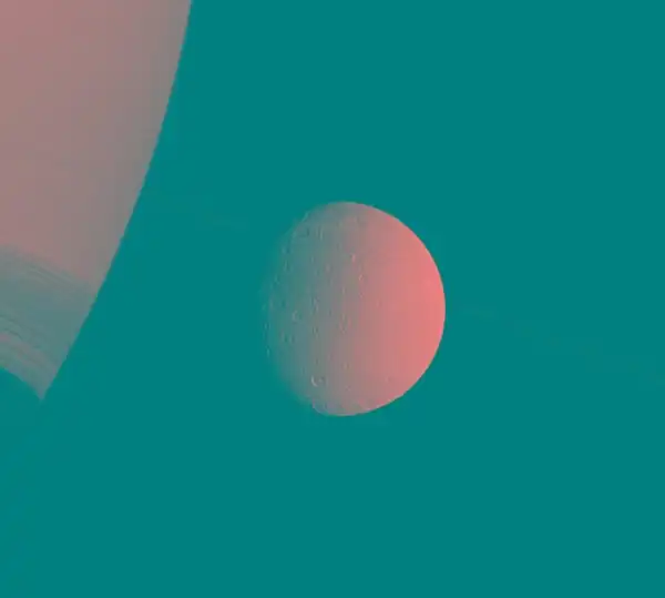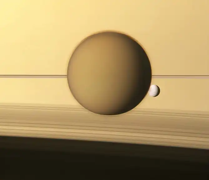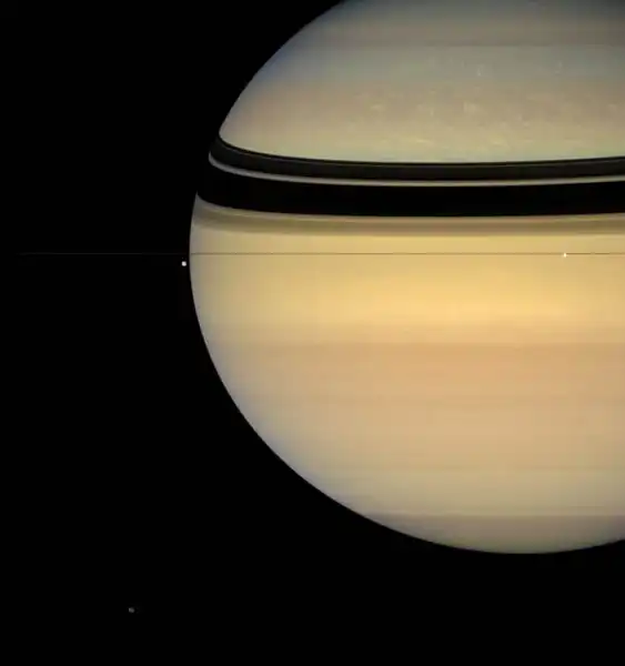 Тефея и Энцелад. Какими крошечными они выглядят на фоне планеты.