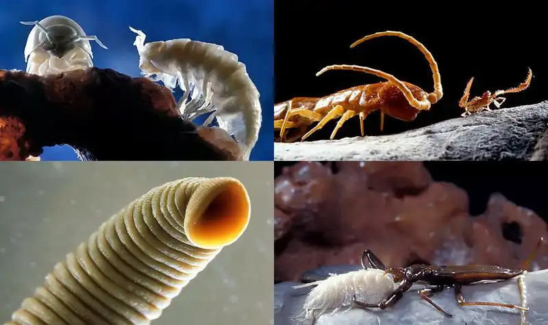 Слева: многоножка Arheboreoiulus зр. ползет в темноте в поисках пищи. Справа: сухопутная мокрица Armadillidium tabacarui.