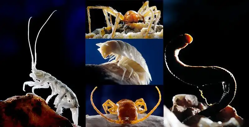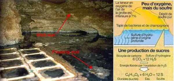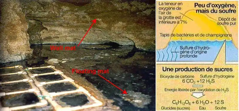Эти автотрофные бактерии служат источником пищи для других, гетеротрофных, бактерий и грибов. Все вместе они образуют бактериальные маты и пленки, покрывающие стены гротов и поверхность воды, особенно в третьем, дальнем воздушном колоколе, где атмосфера наиболее "неземная", и служат пищей для местной "травоядной" фауны – изопод, коллембол, мокриц, ложноскорпионов, на которых охотятся хищники – 5-сантиметровые многоножки и пауки. А под водой, с нижней стороны бактериальной пленки – своя пищевая пирамида: черви, ракообразные, улитки и верховные хищники – пиявки с водяными скорпионами.