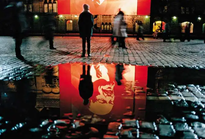 6 ноября 1990-й год, задание журнала «Тайм» снять оформление города перед 7 ноября. Это последнее 7 ноября, когда прошла коммунистическая демонстрация. Кадр был напечатан в «Тайме», и потом он вошел в лучшие фотографии года в Америке — здоровая книга, она у меня есть. А назавтра уже ничего не стало. Все, последняя демонстрация, последний парад. Абзац.