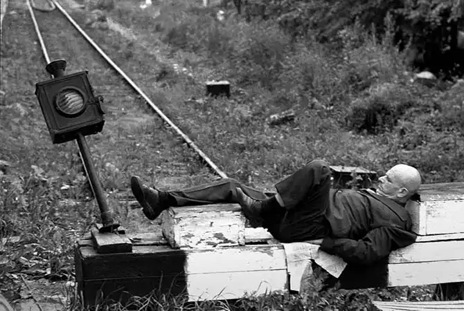 Это «Домодедово» аэропорт, 70-е годы. Я бегу от электрички к зданию аэровокзала. Была плохая погода, и долгое время самолеты не летали, и поэтому все неулетевшие рассосались по аэропорту и вокруг. Человек на снике — не улетел, он спит вот в конце этого железнодорожного «путя».