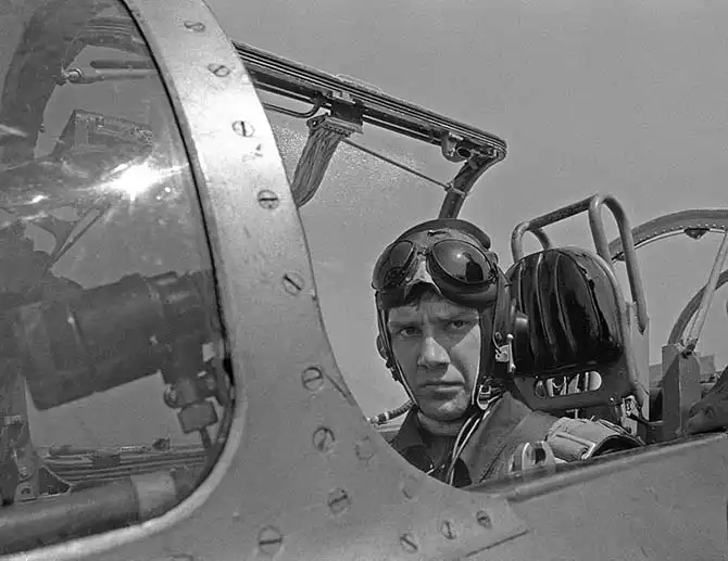 Это будущий лейтенант, перед первым самостоятельным полетом. Вот такой у него взгляд. В первый раз инструктора с ним не будет, он сидит первый в спарке. Это, по-моему, Оренбургское летное училище или Омское — в общем, в тех краях.