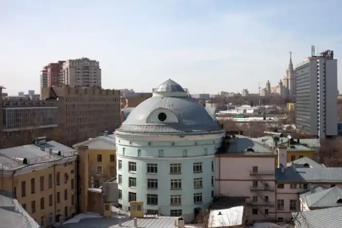 Между Ленинским проспектом и улицей Косыгина во дворах находится странное здание с куполом,