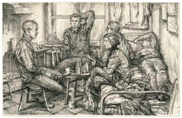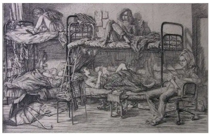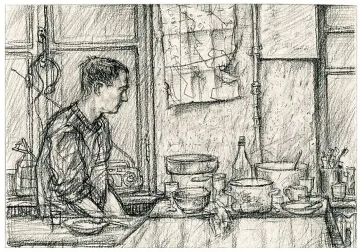 да это же какая то архитектурка! весь антураж до боли знаком) планшеты мольберты горы бумаги... а в перерывах бухач) у нас в общаге только "вертолеты" не стояли.