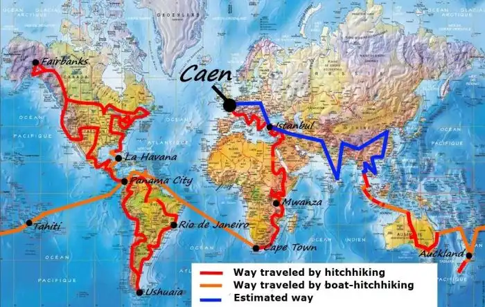 Французу Джереми Мари (Jeremy Marie) потребовалось пять лет, чтобы объехать весь мир, покрыв расстояние в 100000 миль и полагаясь при этом исключительно на доброту незнакомцев, которые подвозили его бесплатно.