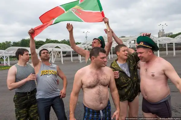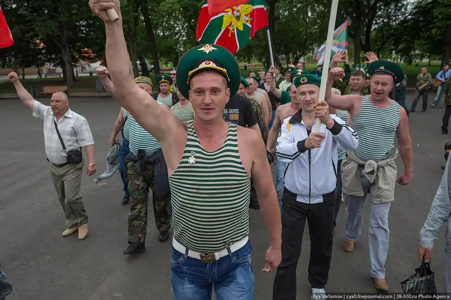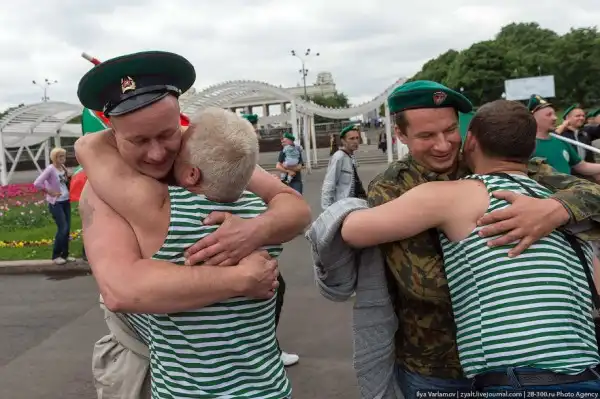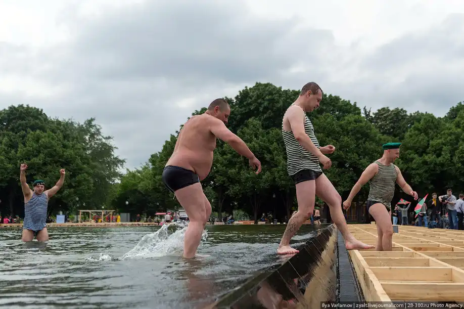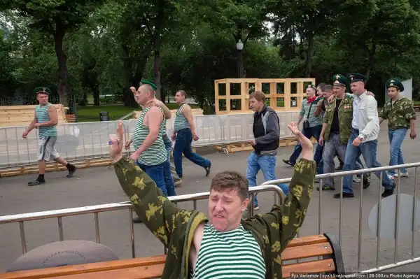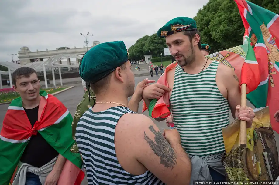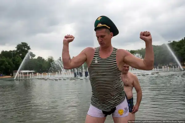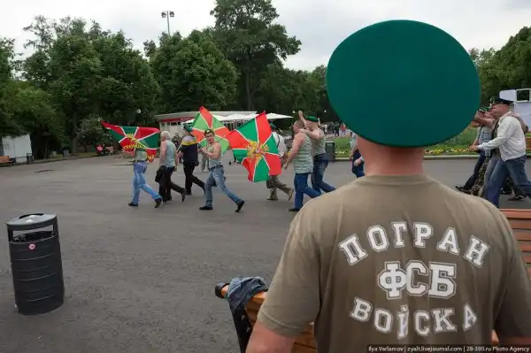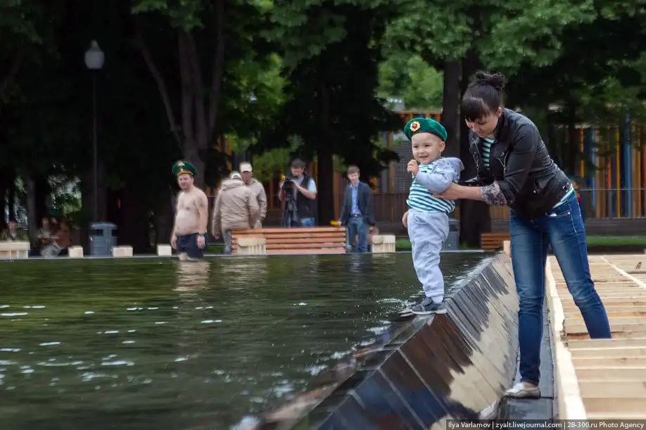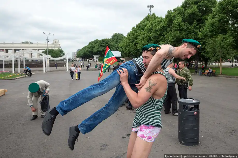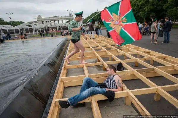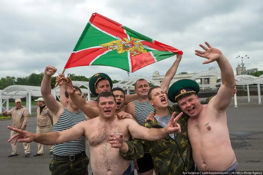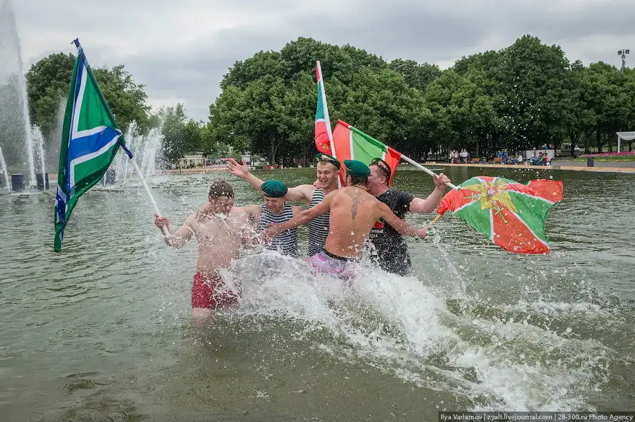 Вчера в России отмечался день пограничника. Милый, добрый, веселый праздник. Каждый год пограничники 28 мая приходят в Парк Горького, чтобы выпить и покупаться в фонтанах. Каждый год в интернете вспыхивают горячие споры можно ли так отмечать праздник и что будет с нашей границе, если ключ у этих людей. Одни говорят – гуляет быдло, которое позорит армию. Другие говорят – ребята отслужили и не вам их судить.