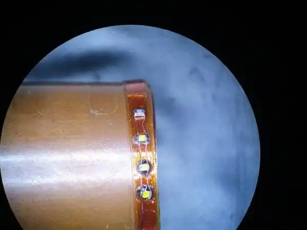 Чтобы сделать подсветку, автор реализовал резонансный трансформатор, который осуществляет беспроводную передачу энергии между двумя обмотками, каждая из которых включена в колебательный контур на близких резонансных частотах. Бен Коукс внедрил в кольцо медную обмотку с конденсатором, к цепи параллельно подключены три светодиода. С конденсатором на 820 pF резонансная частота составила 1,5 МГц.