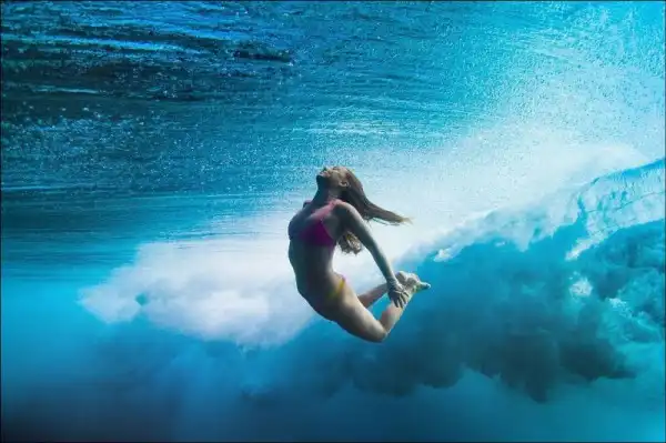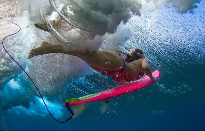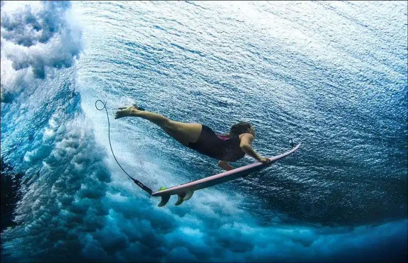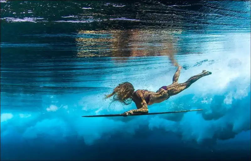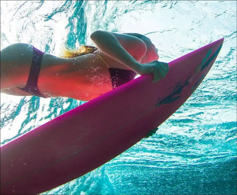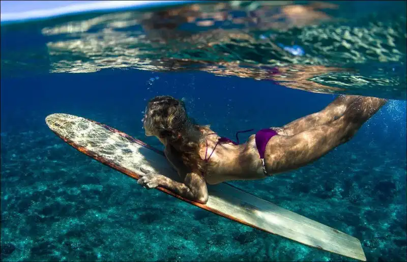 Фотографии сделаны у побережья Гавайских островов, где серферы в бикини рассекают океанские воды в поисках идеальной волны.