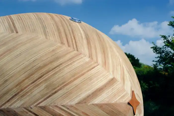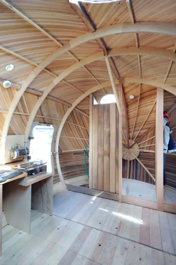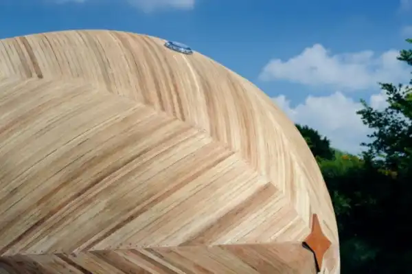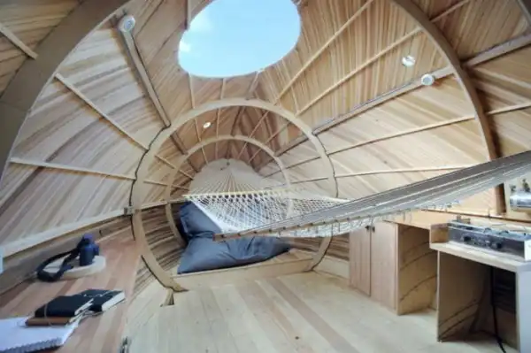 Крошечное жилище предлагает пространство, призванное стать временной лабораторией. Здесь есть только самое необходимое – душ, плита, сиденье, небольшие системы для хранения и кровать-гамак. В качестве энергетического источника Exbury Egg будет использовать только солнце. Приятная палитра светлого дерева создает атмосферу релакса в гармонии с природой, а оригинальная форма привлекает внимание и, вместе с тем, прекрасно адаптируется в природный ландшафт берегов реки.