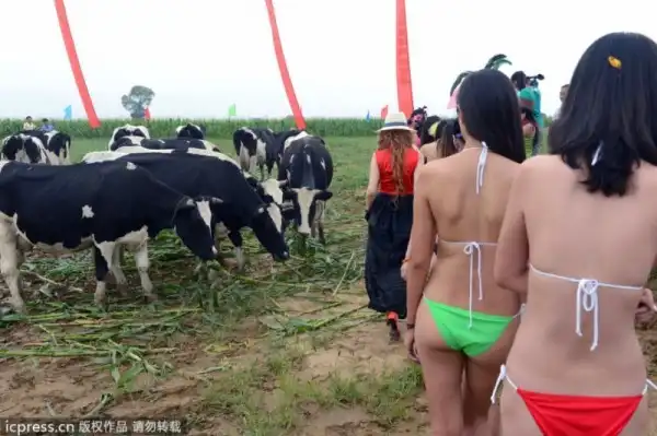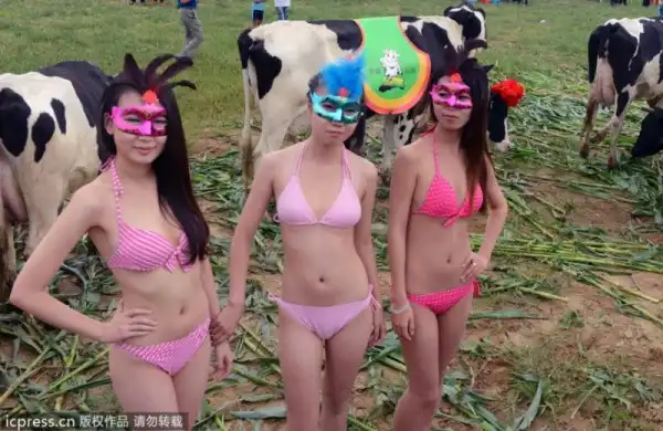 На самом же деле конкурс красоты под названием "Мисс Дойная корова" проводится среди коров. А соревнование выиграла бурёнка с самым красивым выменем и надоем. А что там делали девушкки в масках - без понятия.