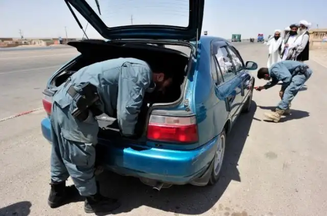 Полиция по борьбе с наркотиками обыскивает легковые и грузовые автомобили на контрольно-пропускном пункте, созданном за пределами города Герат. Только 1% оборота от торговли наркотиками остается внутри Афганистана, сообщает ЮНОДК.