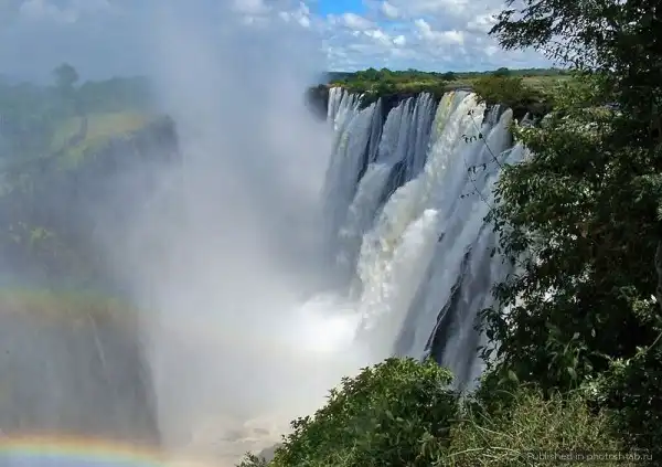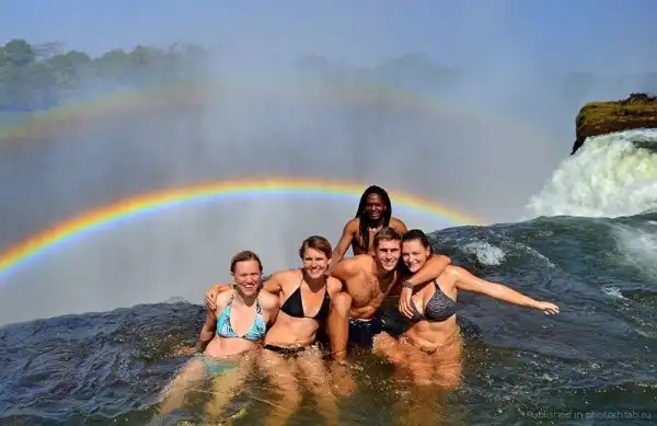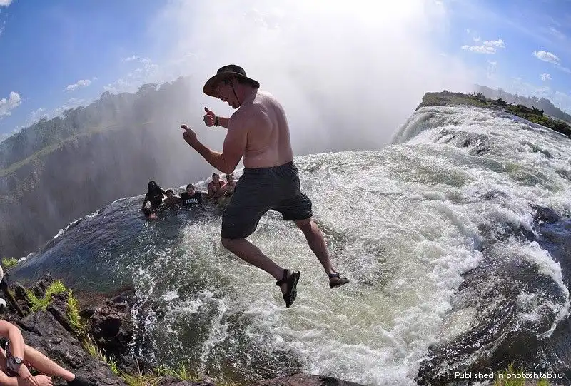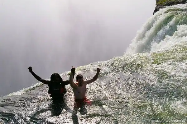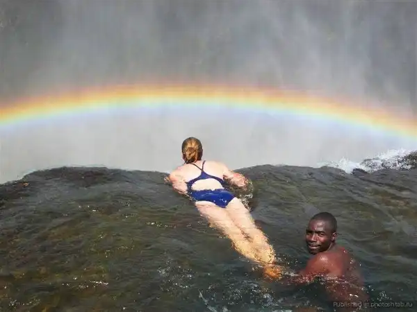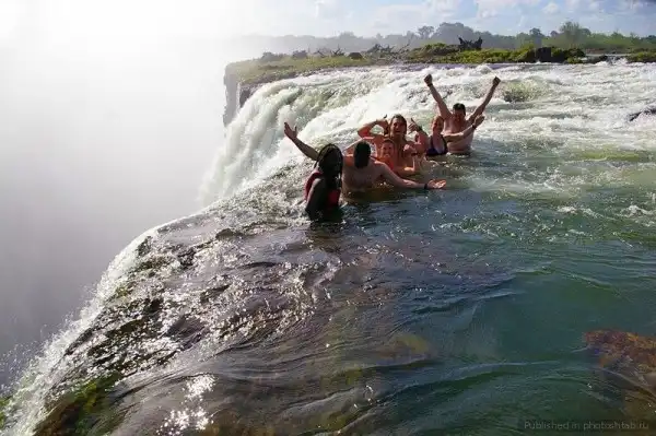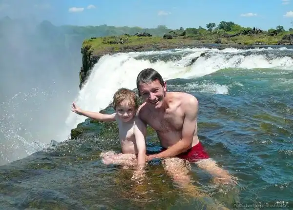 Одним из самых величественных водопадов Земли является водопад Виктория. С высоты 128 метров, тонны воды низвергаются в узкое ущелье. А перед самой пропастью вода, вымыла в скалистом дне настоящий природный бассейн. Кому посчастливилось здесь купаться, никогда не забудут это место.