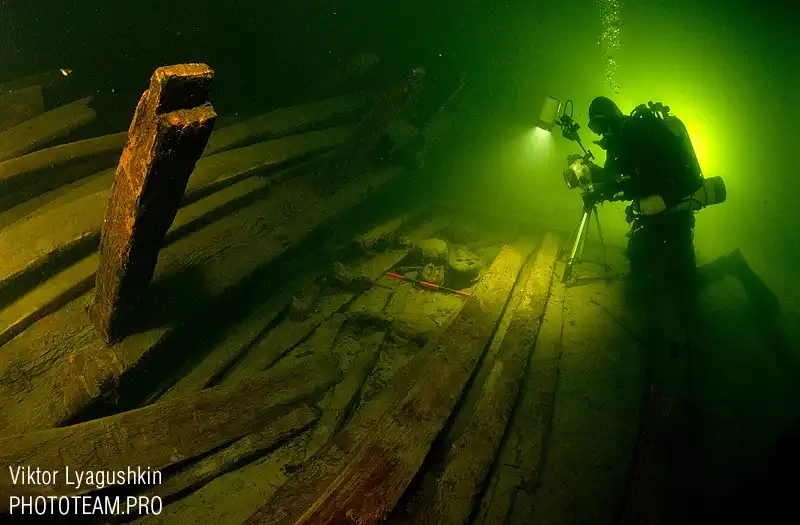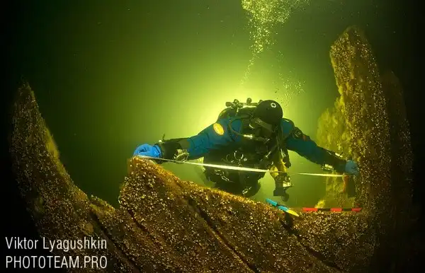 После того, как стало понятно, что груда досок на дне — неизвестно что, начинается кропотливая работа на объекте. Его надо обмерить и заснять, чтобы попытать идентифицировать по размерам, характерным надстройкам, вооружению итдитд.