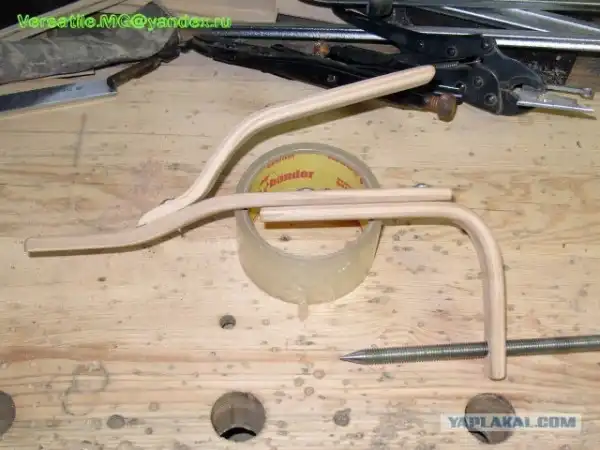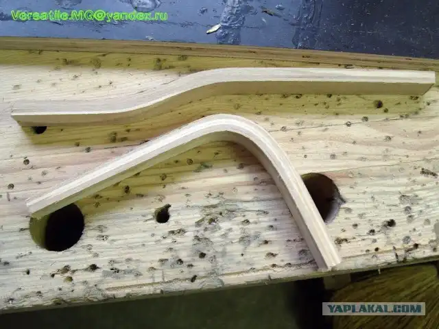 Далее чтобы склеить гнутые детали, нужно жирненько намазать полоски клеем, соединить их вместе и сжать струбцинами между деревяшек, оклеенных скотчем, чтобы не прилипло всё и ко всему подряд :). Когда полоски промазаны клеем, они становятся очень гибкими.