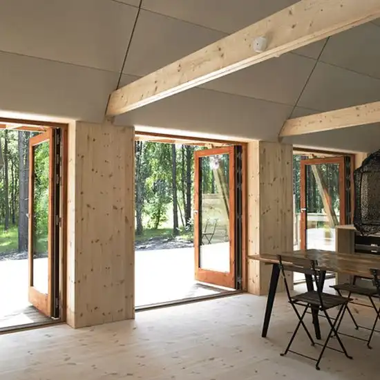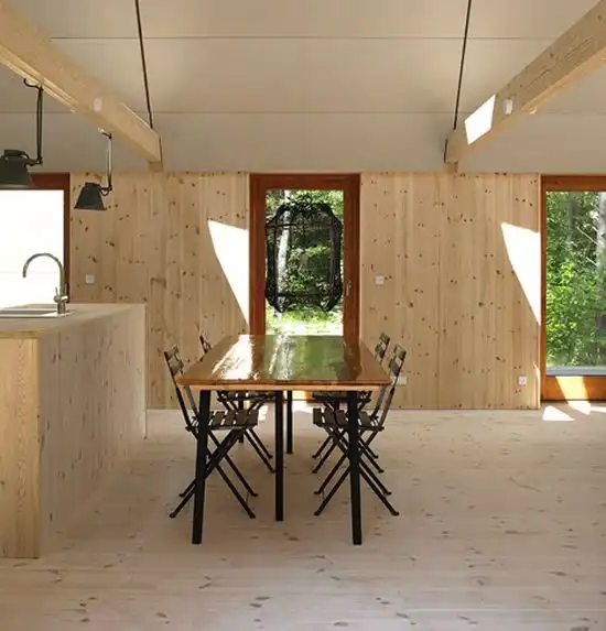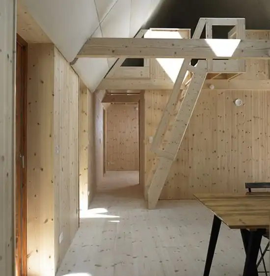Стены интерьера выложены деревянными досками, образуя несколько комнат для двух семей. Двухэтажная гостиная и кухня формируют центр дома, в то время как спальни расположены по краям и на чердаке.